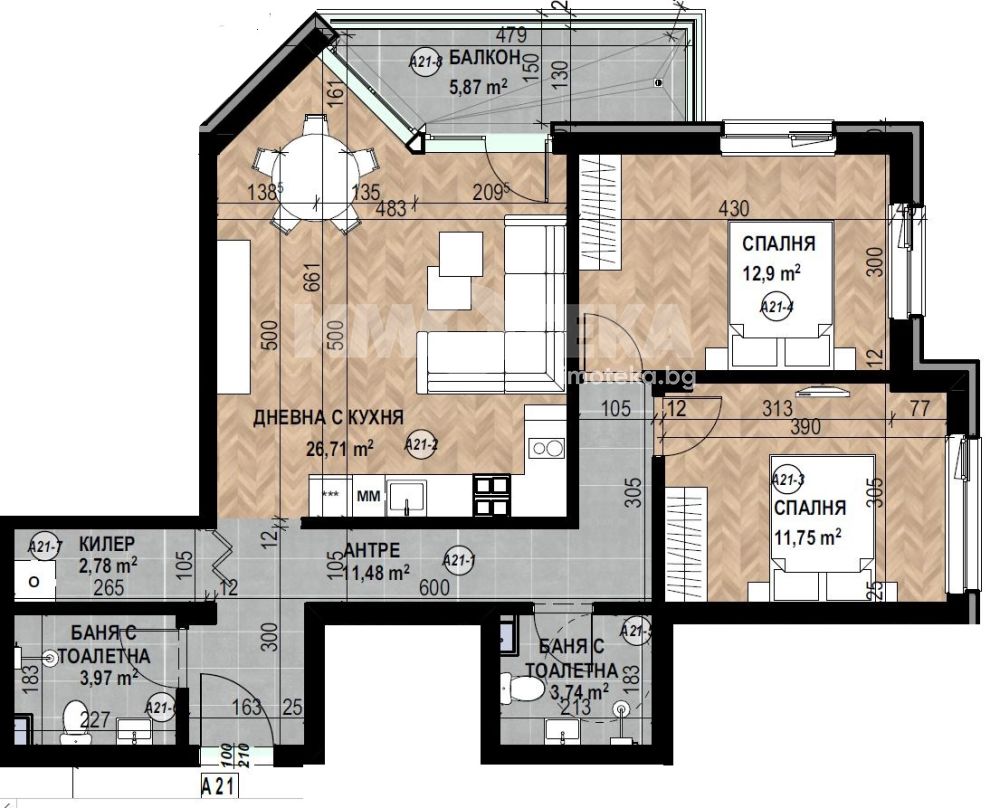 Фукционален тристаен апартамент с чиста площ 93,25 кв. м., състоящ се от дневна с кухня 27 кв.м., две спални съответно по 12 и 13 кв. м., два санитарни възела и северен балкон.
