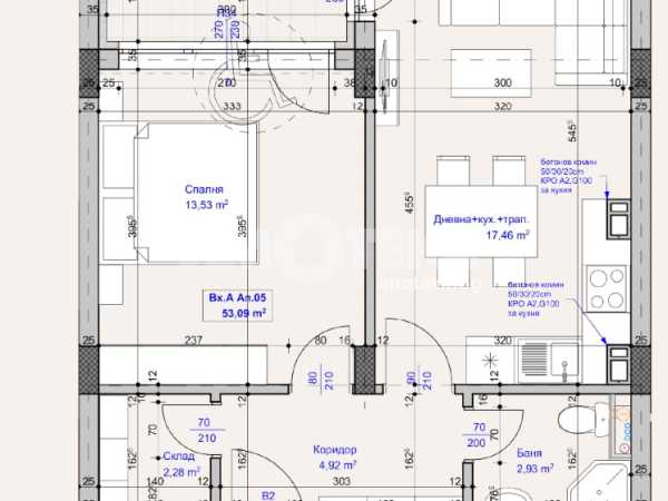 Двустаен апартамент със застроена площ от 53кв, на първи етаж /над партер/, състоящ се от дневна с трапезария и кухненски бокс, спалня, баня с тоалетна, мокро помещение и тераса. Възможност за покупка на други апартаменти в сградата, както и паркоместа и гаражи.
