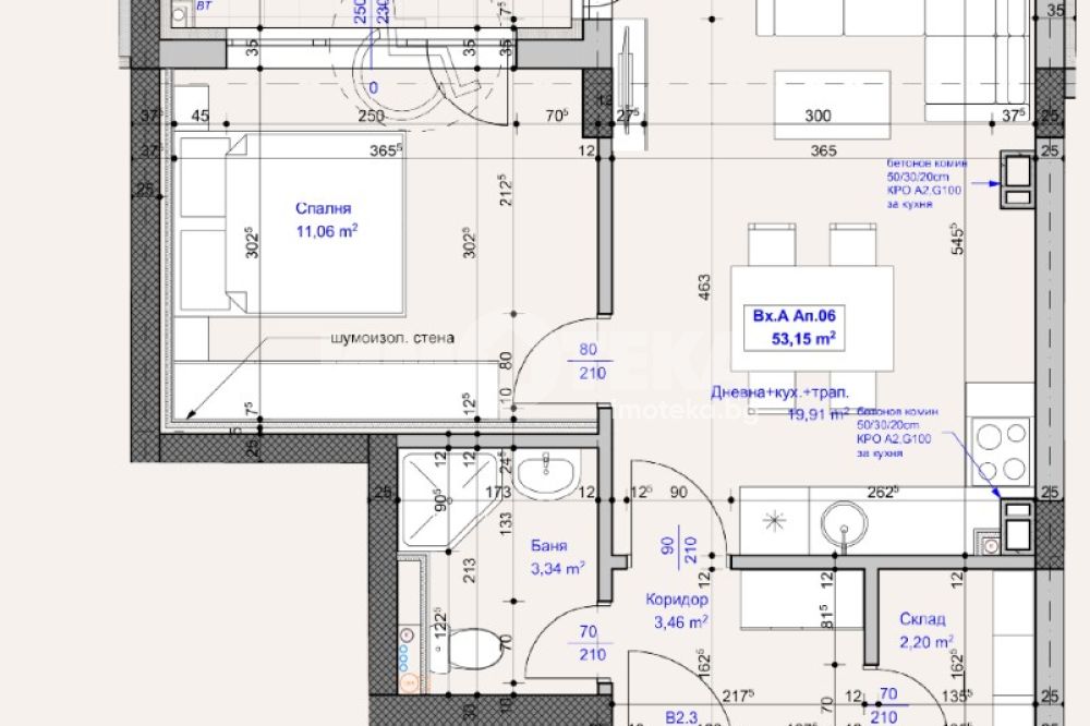 Двустаен апартамент със застроена площ от 53кв, на първи етаж /над партер/, състоящ се от дневна с трапезария и кухненски бокс, спалня, баня с тоалетна, мокро помещение и тераса. Възможност за покупка на други апартаменти в сградата, както и паркоместа и гаражи.