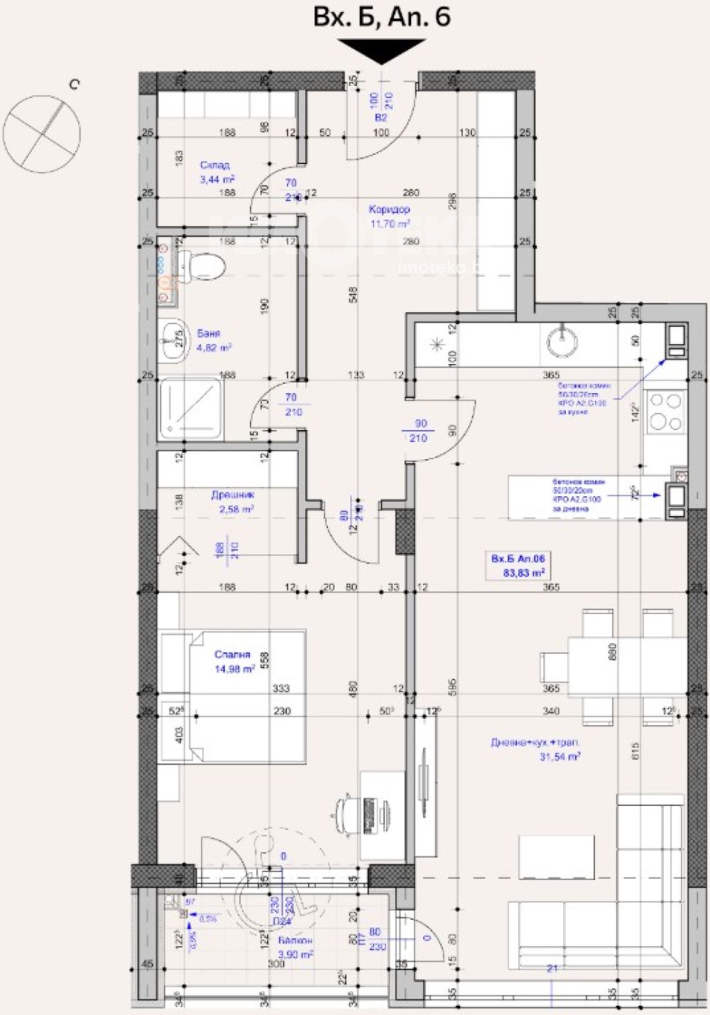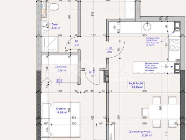 Двустаен апартамент със застроена площ от 84кв, на втори етаж, състоящ се от дневна с трапезария и кухненски бокс, спалня, баня с тоалетна, мокро помещение и тераса. Възможност за покупка на други апартаменти в сградата, както и паркоместа и гаражи.
