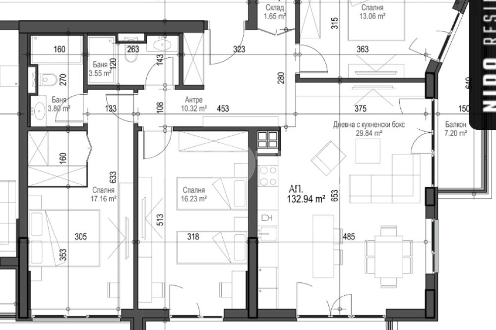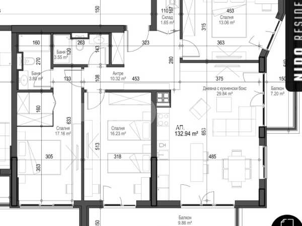 Разпределение:Просторна дневна с кухненски бокс, 3 спални, 2 бани, мокро помещение, 2 тераси.