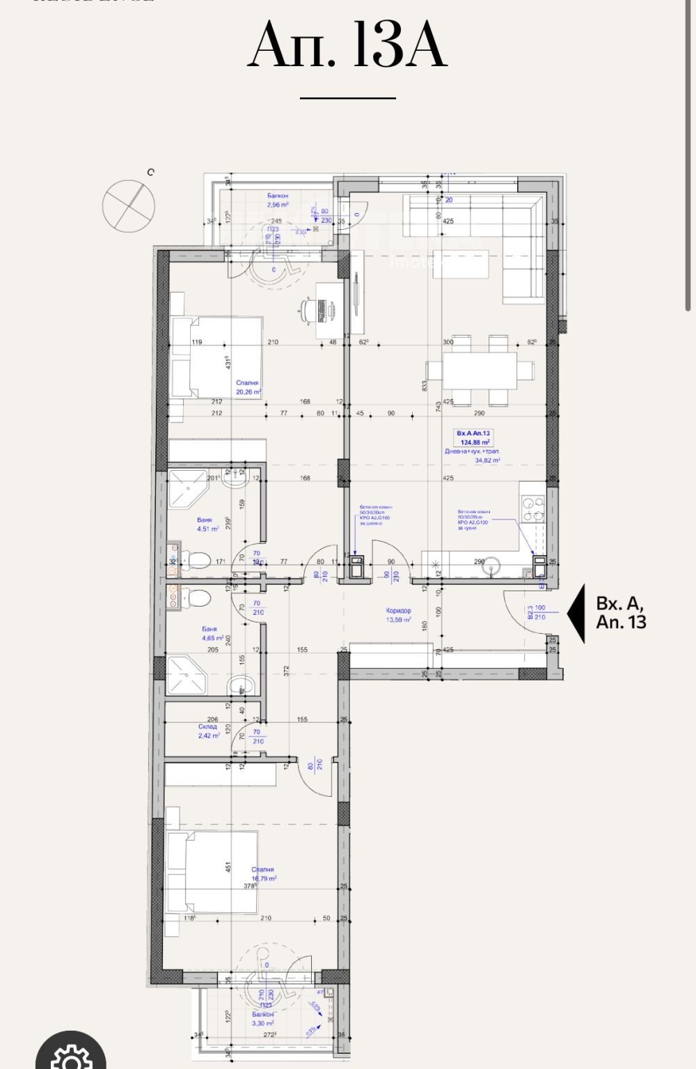 Жилище с удобно разпределение, включващо дневна с кухненски бокс, две спални, отделна тоалетна, баня с тоалетна, мокро помещение и тераса.