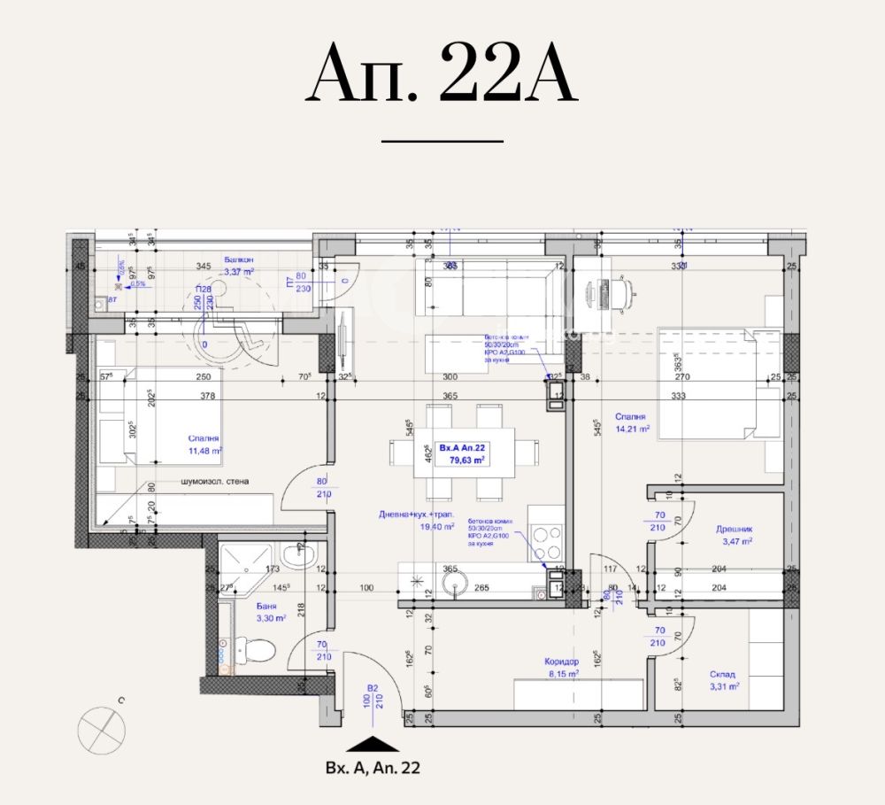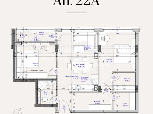 Жилище с удобно разпределение, включващо дневна с кухненски бокс, две спални, отделна тоалетна, баня с тоалетна, мокро помещение и тераса.