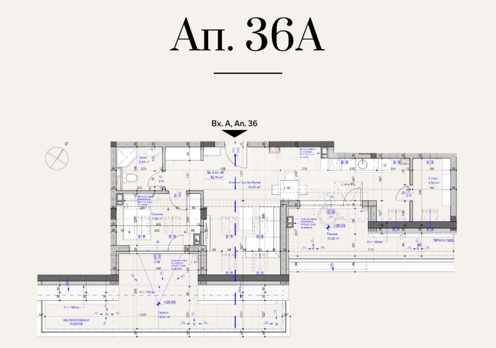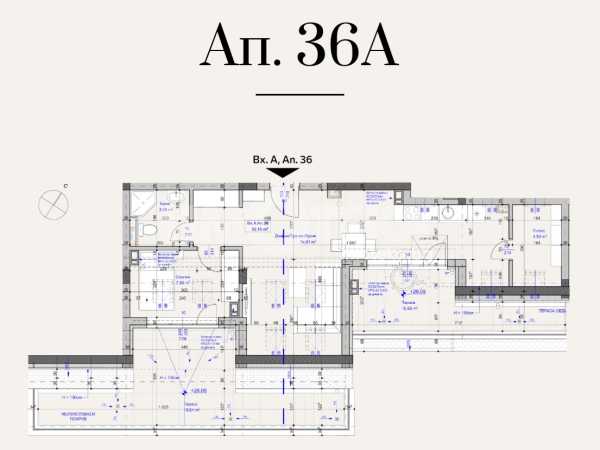 Жилище с удобно разпределение, включващо дневна с кухненски бокс, две спални, отделна тоалетна, баня с тоалетна, мокро помещение и тераса.