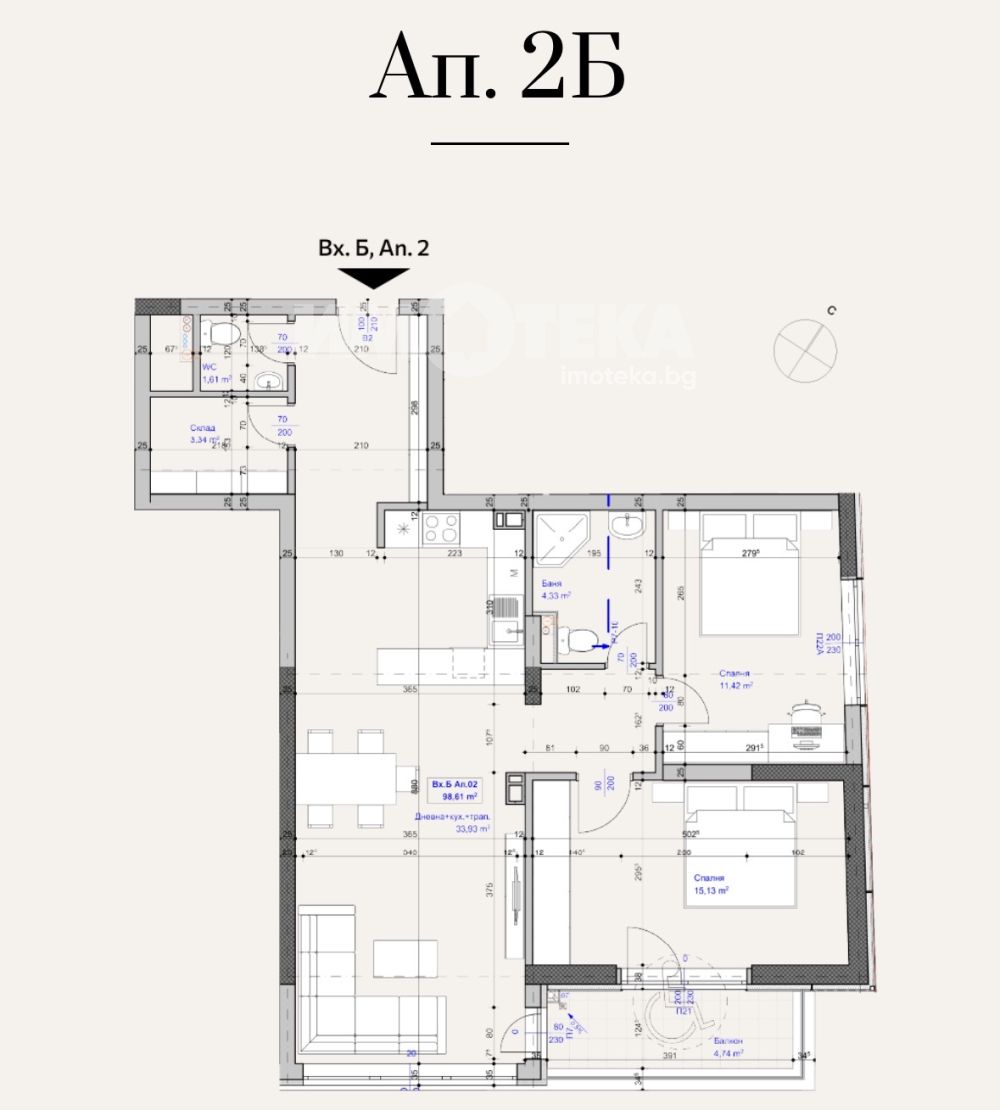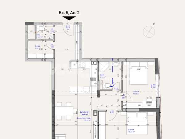 Жилище с удобно разпределение, включващо дневна с кухненски бокс, две спални, отделна тоалетна, баня с тоалетна, мокро помещение и тераса.