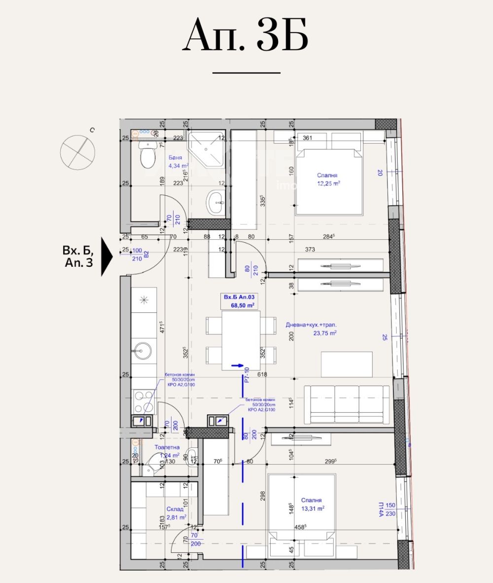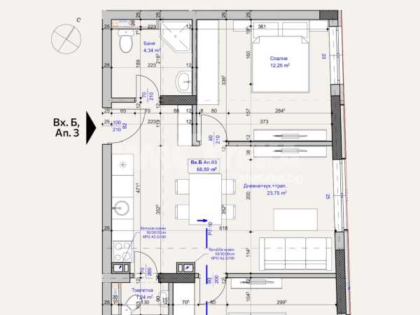 Жилище с удобно разпределение, включващо дневна с кухненски бокс, две спални, отделна тоалетна, баня с тоалетна, мокро помещение и тераса.
