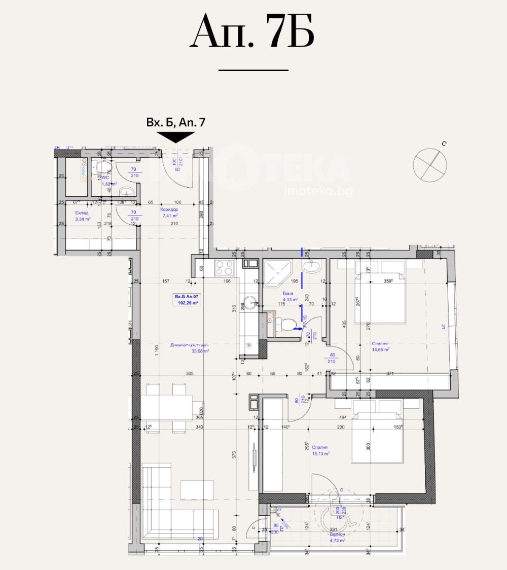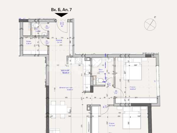 Жилище с удобно разпределение, включващо дневна с кухненски бокс, две спални, отделна тоалетна, баня с тоалетна, мокро помещение и тераса.