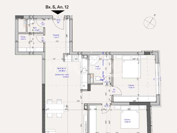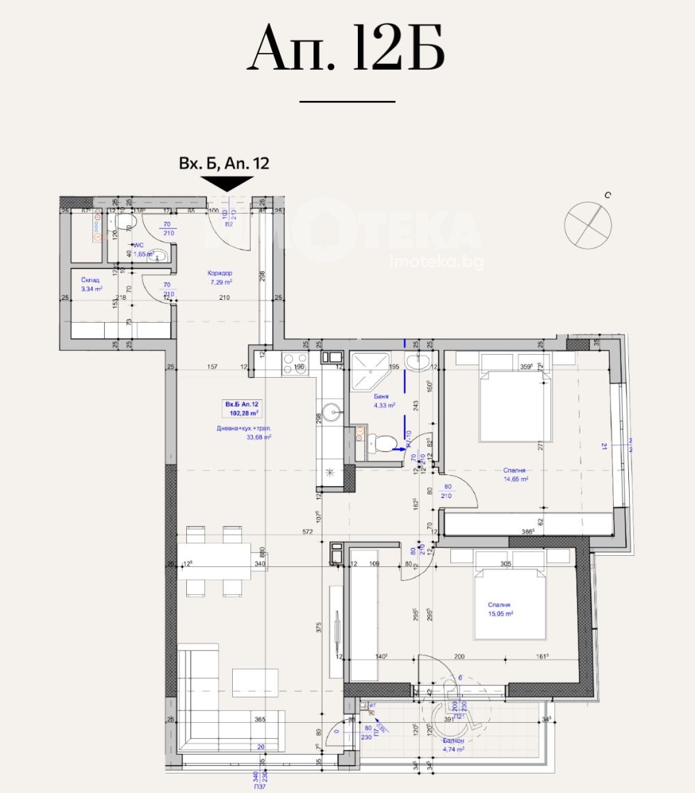 Жилище с удобно разпределение, включващо дневна с кухненски бокс, две спални, отделна тоалетна, баня с тоалетна, мокро помещение и тераса.