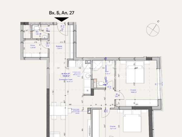 Жилище с удобно разпределение, включващо дневна с кухненски бокс, две спални, отделна тоалетна, баня с тоалетна, мокро помещение и тераса.