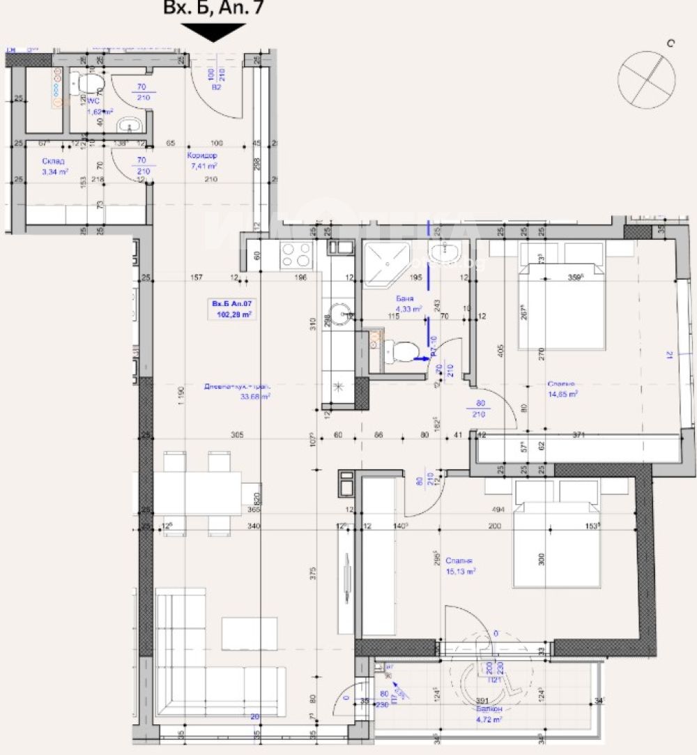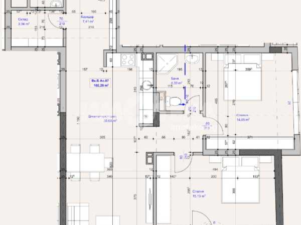 Тристаен апартамент със застроена площ от 102кв, на втори етаж, състоящ се от дневна с трапезария и кухненски бокс, две спални, тоалетна, баня с тоалетна, мокро помещение и тераса. Възможност за покупка на други апартаменти в сградата, както и паркоместа и гаражи.