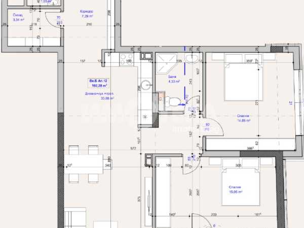 Тристаен апартамент със застроена площ от 102кв, на трети етаж, състоящ се от дневна с трапезария и кухненски бокс, две спални, тоалетна, баня с тоалетна, мокро помещение и тераса. Възможност за покупка на други апартаменти в сградата, както и паркоместа и гаражи.