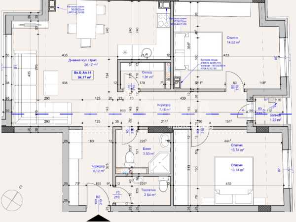 Тристаен апартамент със застроена площ от 94кв, на трети етаж, състоящ се от дневна с трапезария и кухненски бокс, две спални, тоалетна, баня с тоалетна, мокро помещение и тераса. Възможност за покупка на други апартаменти в сградата, както и паркоместа и гаражи.