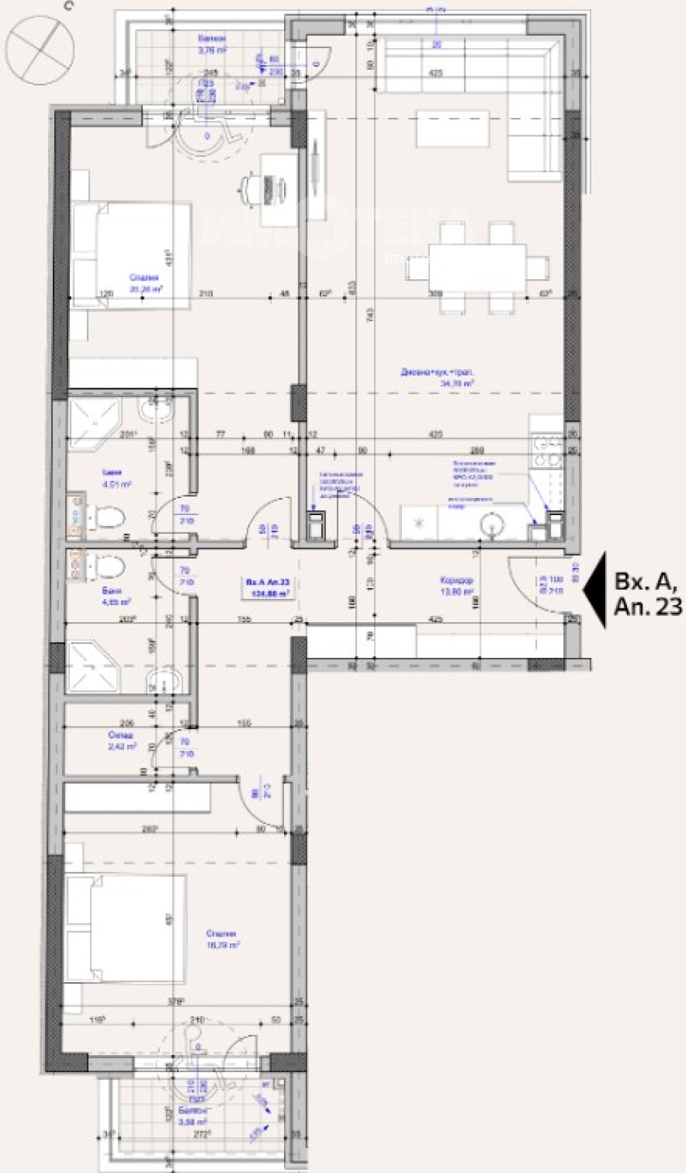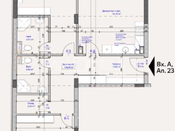 Тристаен апартамент със застроена площ от 125кв, на пети етаж, състоящ се от дневна с трапезария и кухненски бокс, две спални, две бани с тоалетни, мокро помещение и две тераси. Възможност за покупка на други апартаменти в сградата, както и паркоместа и гаражи.