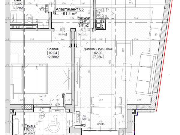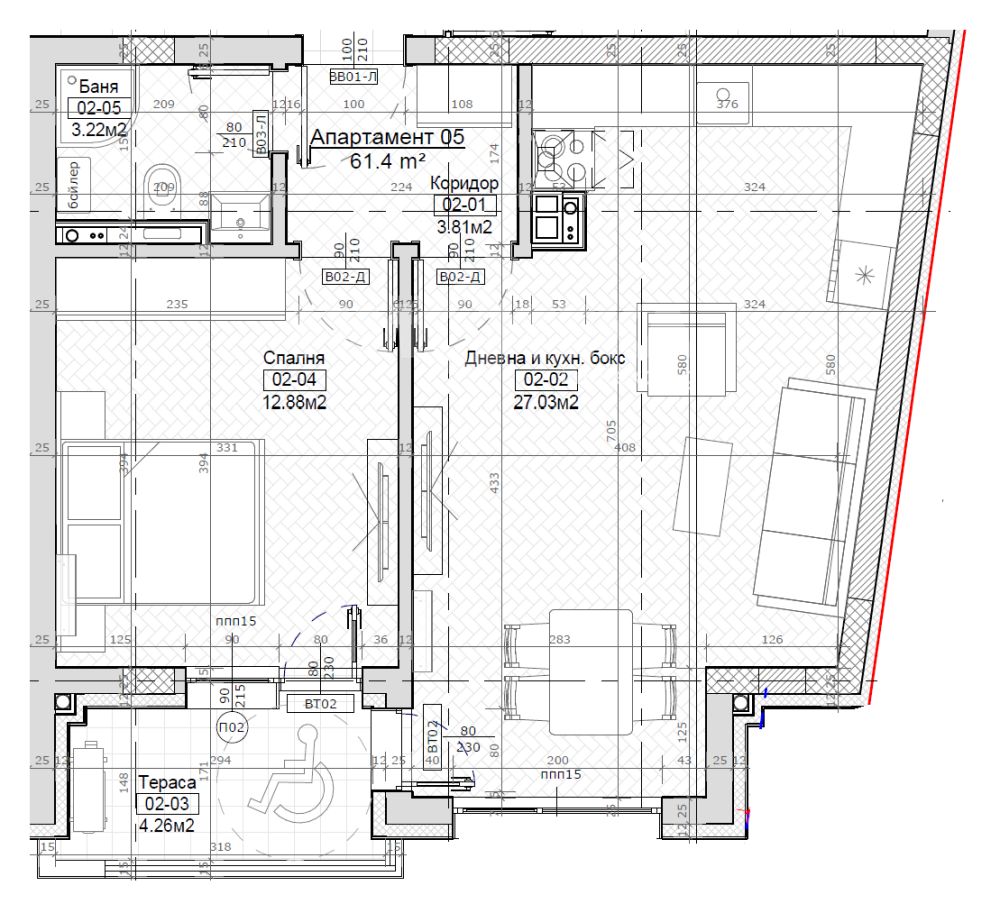 Апартамент 5 със склад 5. Двустаен апартамент на етаж трети, кота +6,10м. с РЗП- 85,01кв.м. и ЗП-61,40кв.м. Разпределение: антре, голяма дневна с кухненски бокс и трапезария-27,05кв.м., спалня- 12,88кв.м,. баня с тоалетна -3,22кв.м. и тераса-4,26кв.м. Налични ПМ и гараж