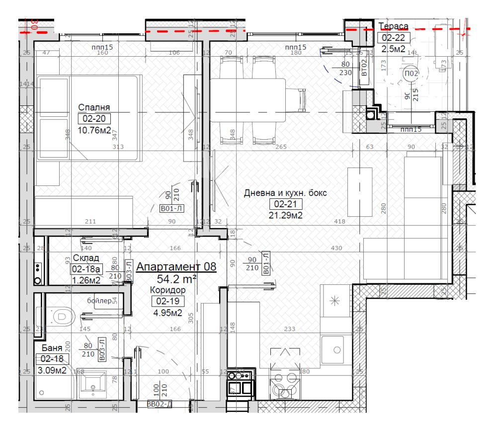 Апартамент 8 със склад 9- Двустаен апартамент на трети кота +6,10м. с РЗП- 75,23кв.м. и ЗП-54,20кв.м. Разпределение: антре, дневна с кухненски бокс и трапезария-21,92кв.м., спалня- 10,76кв.м. баня с тоалетна -3,09кв.м. и тераса-2,50кв.м. Налични ПМ и гаражи.