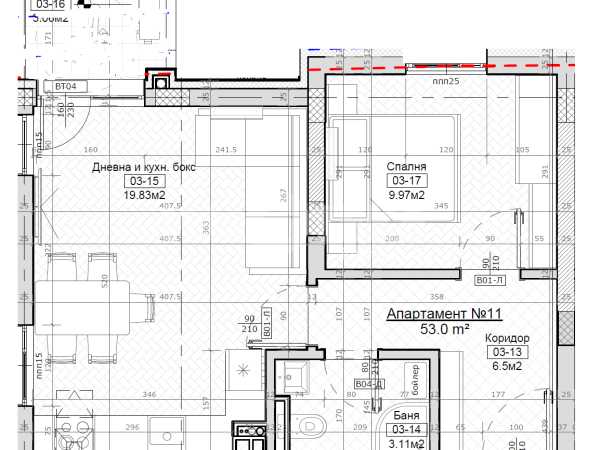 Апартамент 11 със склад 12- Двустаен апартамент на четвърти, кота +9,00м. с РЗП- 73,69кв.м. и ЗП-53,00кв.м. Разпределение: антре, дневна с кухненски бокс и трапезария-19,83кв.м., спалня- 9,97кв.м. баня с тоалетна -3,11кв.м. и тераса. Налични ПМ и гаражи.