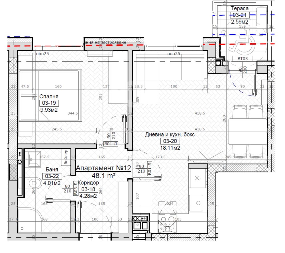 Апартамент 12 със склад 13- Двустаен апартамент на четвърти, кота +9,00м. с РЗП- 66,83кв.м. и ЗП-48,10кв.м. Разпределение: антре, дневна с кухненски бокс и трапезария-18,11кв.м., спалня- 9,93кв.м. баня с тоалетна -4,01кв.м. и тераса-2,59кв.м. Налични ПМ и гаражи.