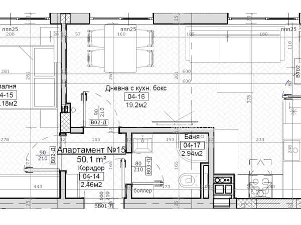 Апартамент 15 със склад 15- Двустаен апартамент на пети, кота +11,90м. с РЗП- 70,32кв.м. и ЗП-50,10кв.м. Разпределение: антре, дневна с кухненски бокс и трапезария-19,20кв.м., голяма спалня- 13,18кв.м. баня с тоалетна-2,94кв.м. и тераса-2,06кв.м. Налични ПМ и гаражи.