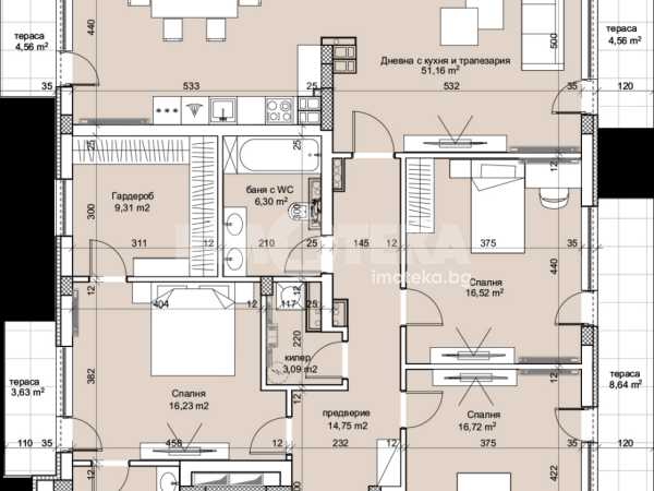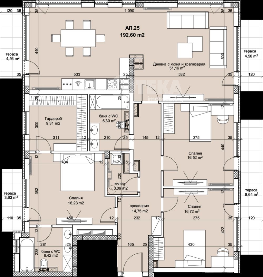 Многостаен апартамент състоящ се от дневана с кухненски бокс, три спални, три санитарни и три тераси. Цената е без ДДС.