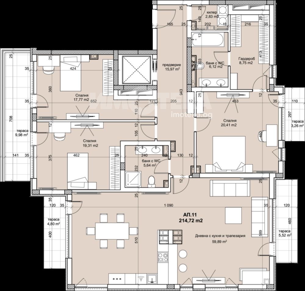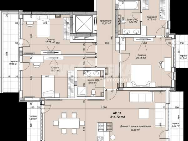 Многостаен апартамент състоящ се от дневана с кухненски бокс, три спални, две бани, гардеробно, клиер и тераси.