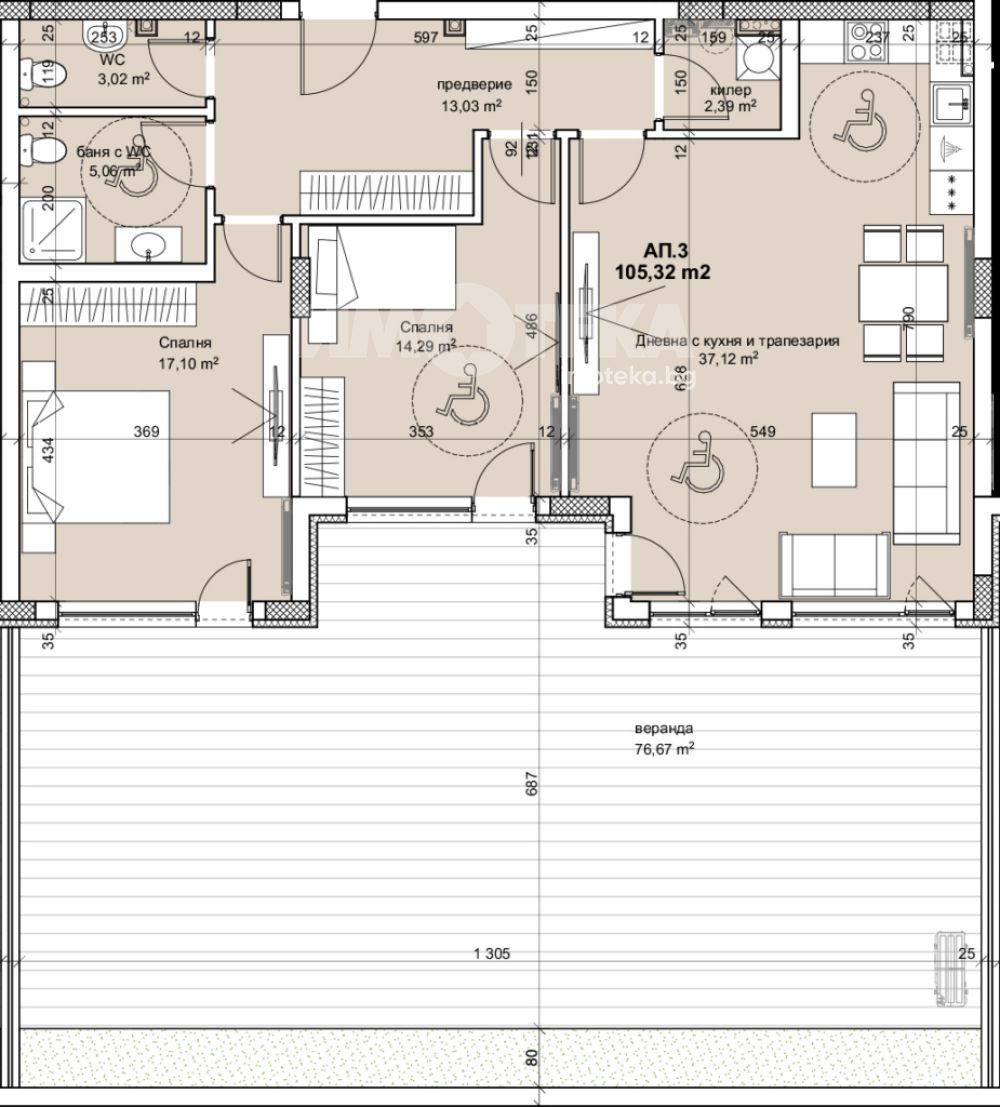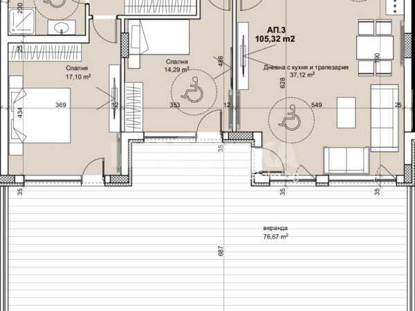 Тристаен апартамент състоящ се от дневана с кухненски бокс, две спални, три санитарни и голяма веранда с площ от 76кв.м.