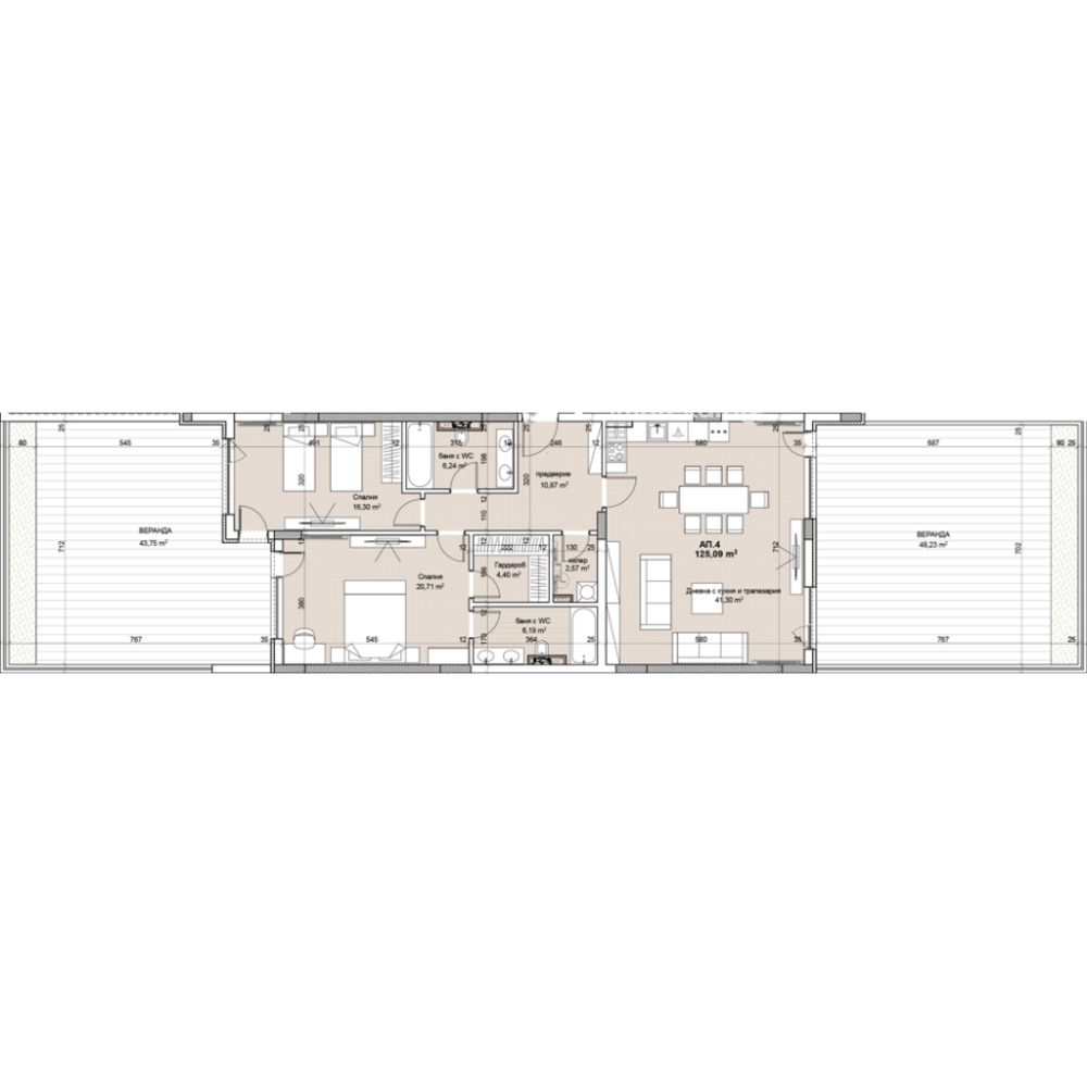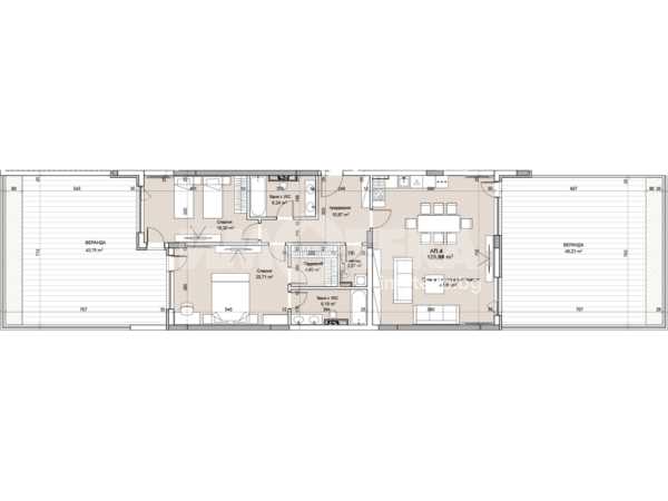 Тристаен апартамент състоящ се от дневана с кухненски бокс, две спални, две бани, склад и две веранди. Цената е без ДДС