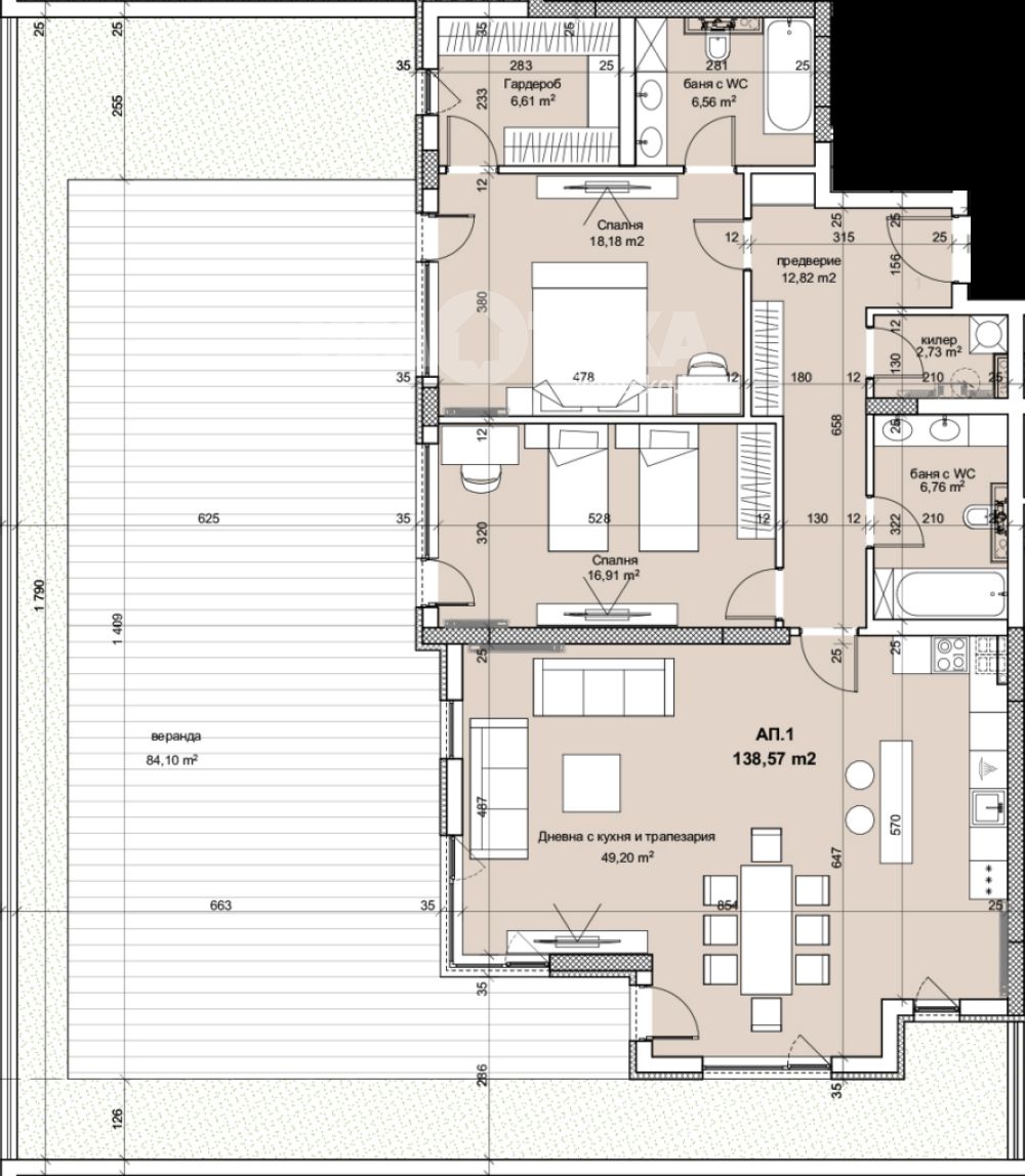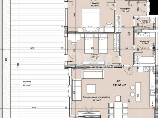 Тристаен апартамент състоящ се от дневана с кухненски бокс, две спални, три санитарни и голяма веранда. Цената е без ДДС.