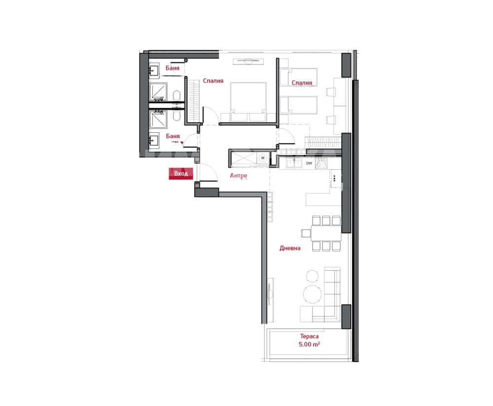 Апартаментът впечатлява с просторна дневна с кухненски бокс и трапезария, идеална за съвременен начин на живот и социални моменти, с излаз към тераса за отдих. Разпределението включва две комфортни спални, две бани, функционално антре и ясно обособена дневна и нощна зона, осигуряващи максимален комфорт и уединение.