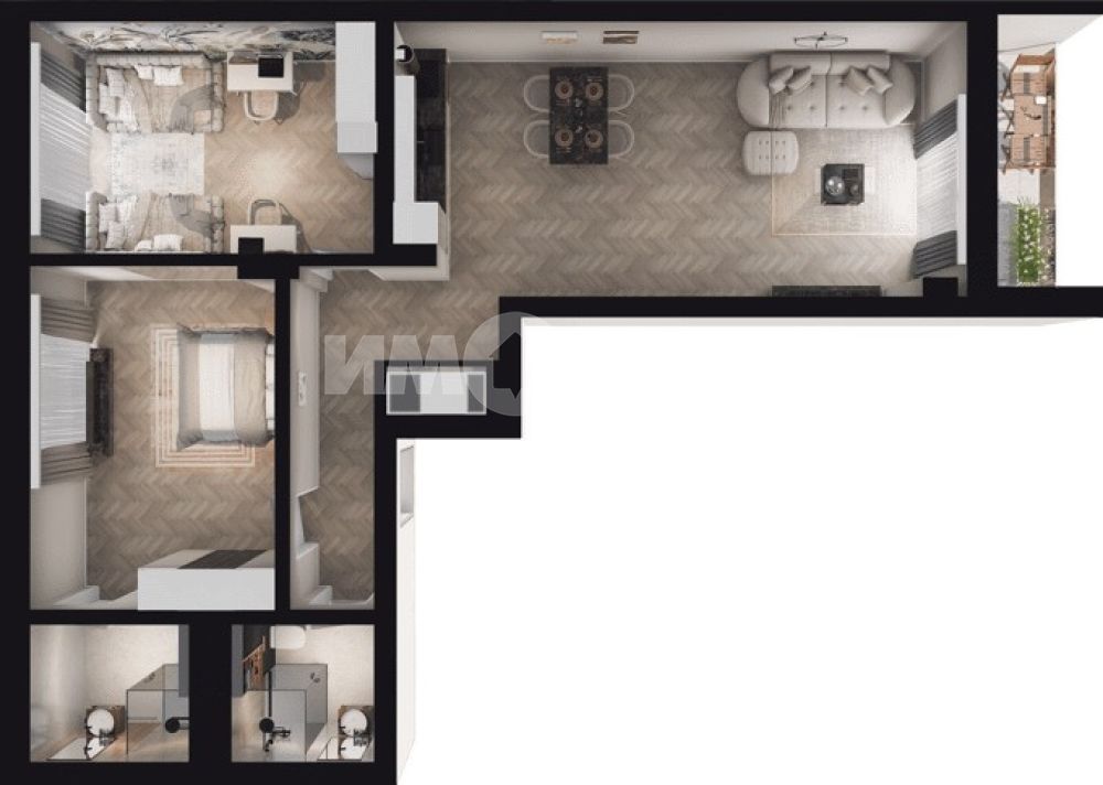 Апартаментът впечатлява с просторна дневна с кухненски бокс и трапезария, идеална за съвременен начин на живот и социални моменти, с излаз към тераса за отдих. Разпределението включва две комфортни спални, две бани, функционално антре и ясно обособена дневна и нощна зона, осигуряващи максимален комфорт и уединение.