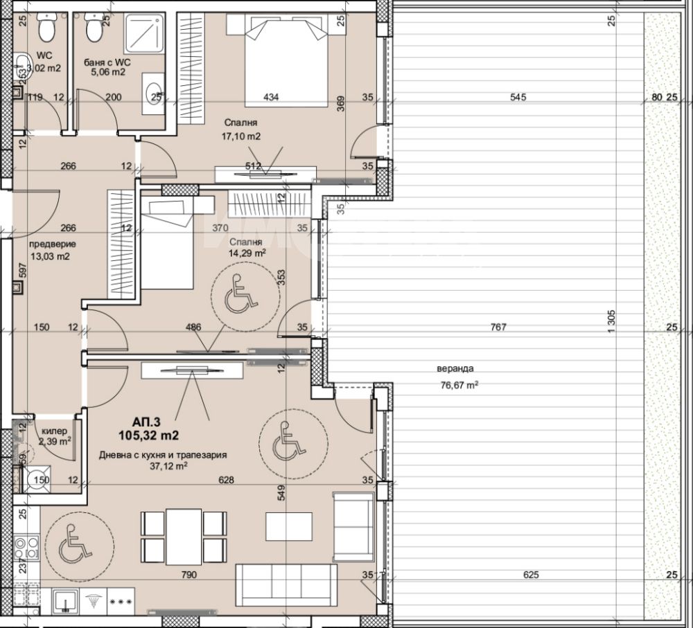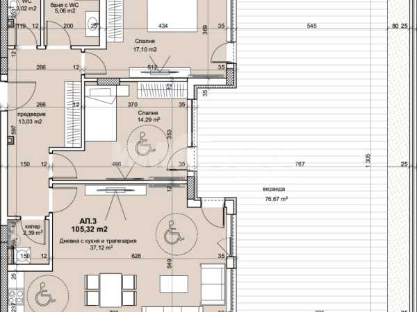 Тристаен апартамент състоящ се от дневна с бокс, две спални, две санитарни, килер и голяма дворна тераса.