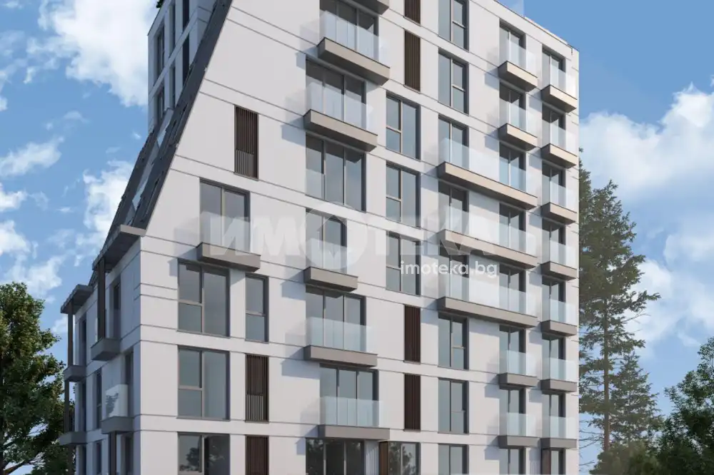 Нова, девететажна жилищна сграда с модерна архитектура.