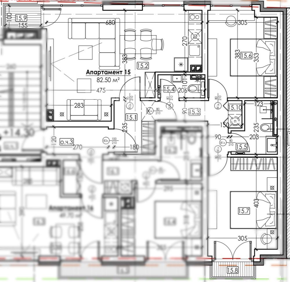 Тристаен апартамент с източно изложение, състоящ се от : антре, два санитарни възела, светъл хол, две спални, едната от които с излаз към тераса.