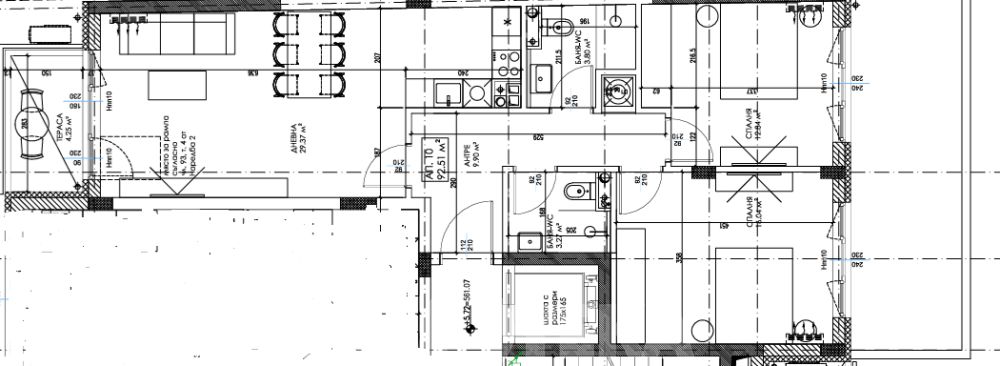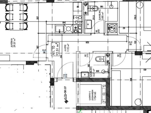 Хол с бокс и трапезария 29.5 кв.м; спалня 16 кв. м, детска 13 кв. м, балкон 4,25 кв. м; бани по 3.5 кв.м; мокро помещение. Изложение: север-юг. Ще се използват строителни материали, произведени от водещи в бранша производители, асансьор за шест лица, външни подсилени врати, на ш/з. Застроена площ 92.51 кв. м.
