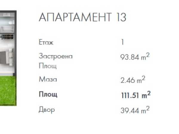 Партерен тристаен апартамент със застроена площ от 94.84 кв.м. Състои се от: дневна с кухненски бокс 28.61 кв.м., спалня 18.50 кв.м., втора спалня 13.83 кв.м., тераса тип лоджия 6.75 кв.м., две бани с тоалетни и прилежащ двор от 39.44 кв.м. Изложението е западно. Към жилището има складово помещение от 5.20 кв.м. Има възможност за закупуване на подземно паркомясто на отделна цена.