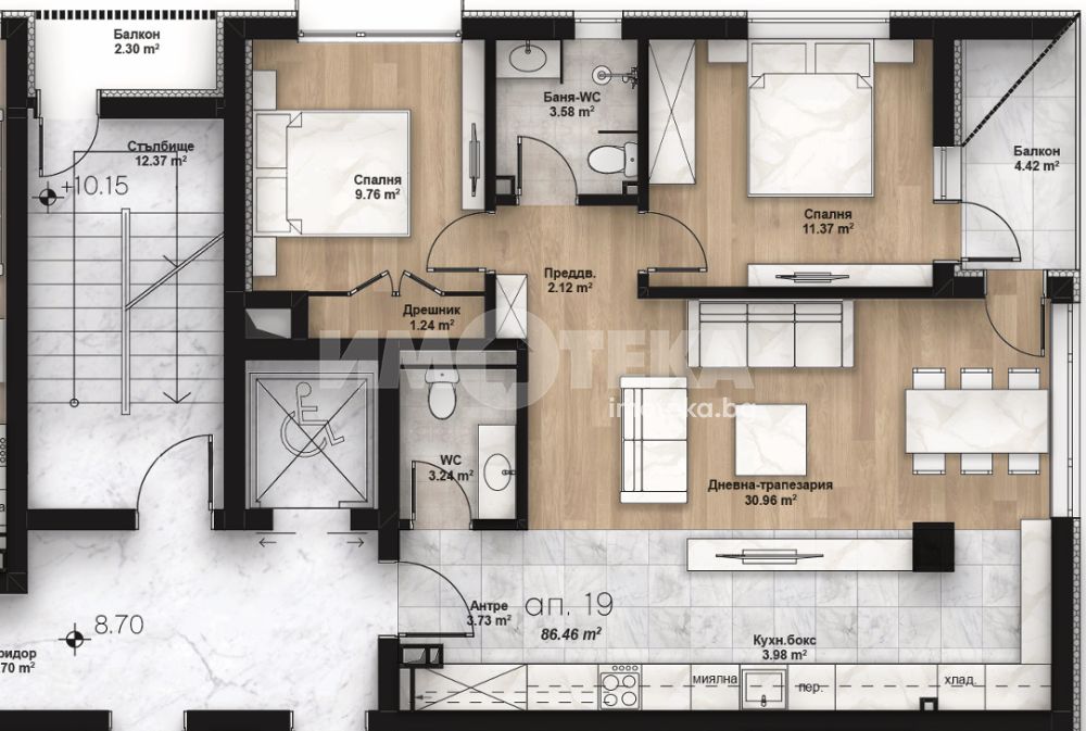 Апартамент 19 е разположен на 4-ти етаж от седем.