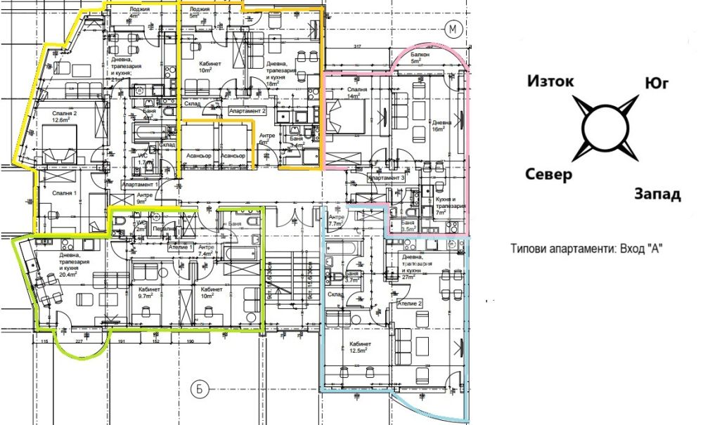 Тристайно ателие със застроена площ от 69,5 кв.м., състоящо се от входно антре, дневна с кухненски бокс, две спални, баня с тоалетна, отделна тоалетна, мокро помещение и балкон.