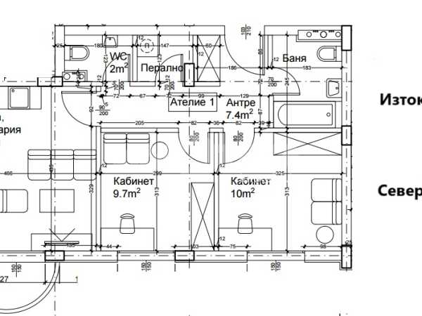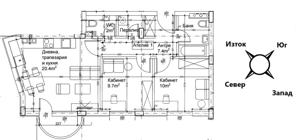 Тристайно ателие със застроена площ от 69,5 кв.м., състоящо се от входно антре, дневна с кухненски бокс, две спални, баня с тоалетна, отделна тоалетна, мокро помещение и балкон.