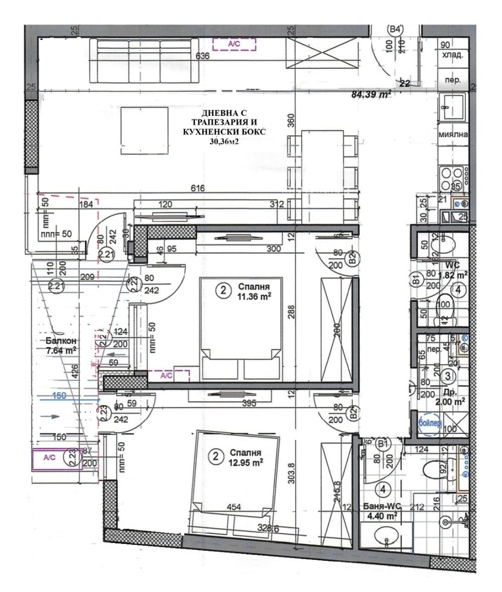 Тристаен апартамент в новострояща се сграда със собствен двор в Люлин 2. Апартаментът е разположен на етаж четири от седем с разпределение: дневна -трапезария, кухненски бокс -30,36м2, спалня -11,36м2, втора спалня -12,95м2, баня с WC-3,53m2, мокро -2,00м2, тоалетна -1,82м2 и балкон-7,64м2. Към апартамента има и подземно паркомясто със складово помещение. Отоплението е предвидено на ТЕЦ. Отлични транспортни връзки, изградена инфраструктура.