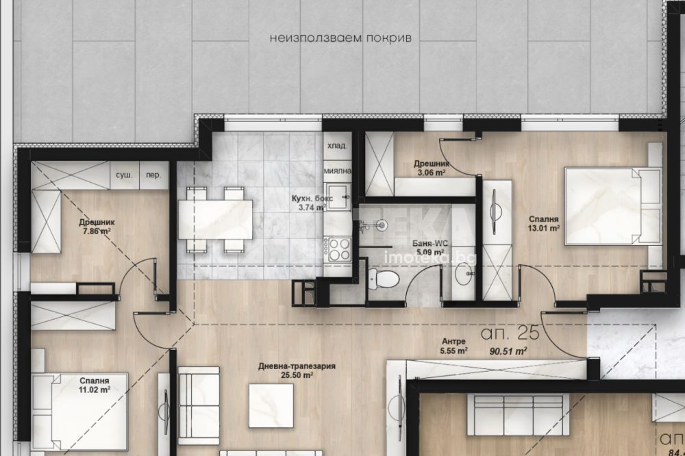 • просторна дневна с кухня и трапезария – 29 кв.м