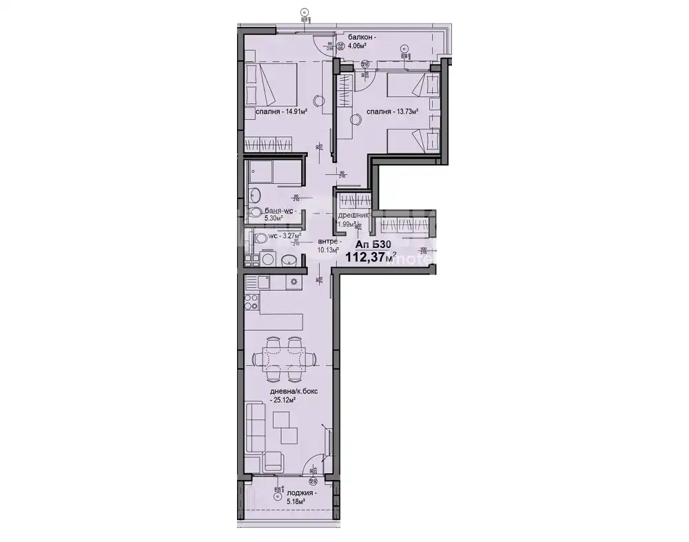 Тристаен апартамент, състоящ се от: дневна с кухненски бокс и трапезария, две спални помещения, баня с тоалетна и дрешник.