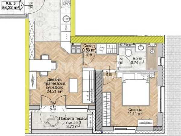Върху площ от 64 кв.м са разположени хол с трапезария и кухненски бокс (24 кв.м), спалня 11 кв.м, баня и тераса.