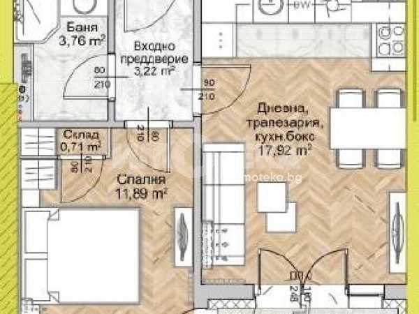 Върху площ от 56 кв.м са разположени хол с трапезария и кухненски бокс (18 кв.м), спалня 12 кв.м, баня и тераса.
