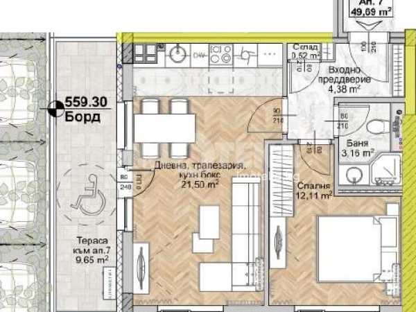 Върху площ от 58 кв.м са разположени хол с трапезария и кухненски бокс (17 кв.м), спалня 11 кв.м, баня и тераса.