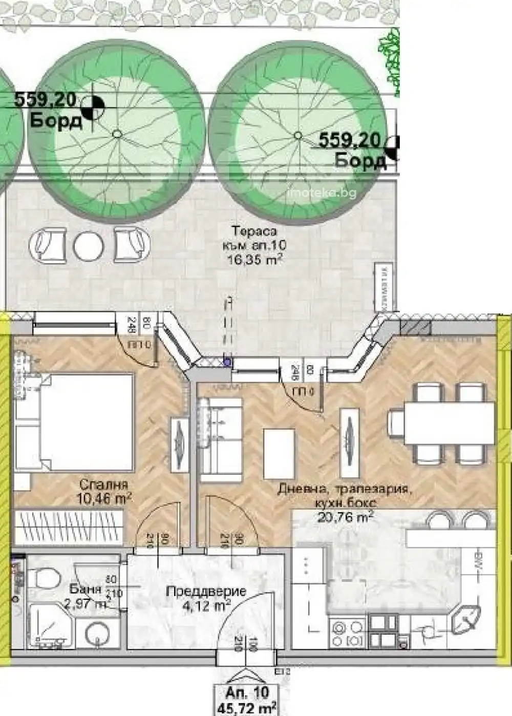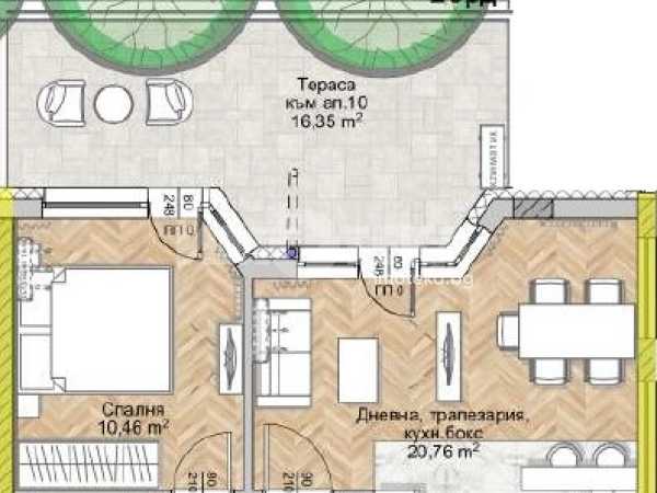 Върху площ от54 кв.м са разположени хол с трапезария и кухненски бокс (21 кв.м), кабинет 11 кв.м, баня и тераса.