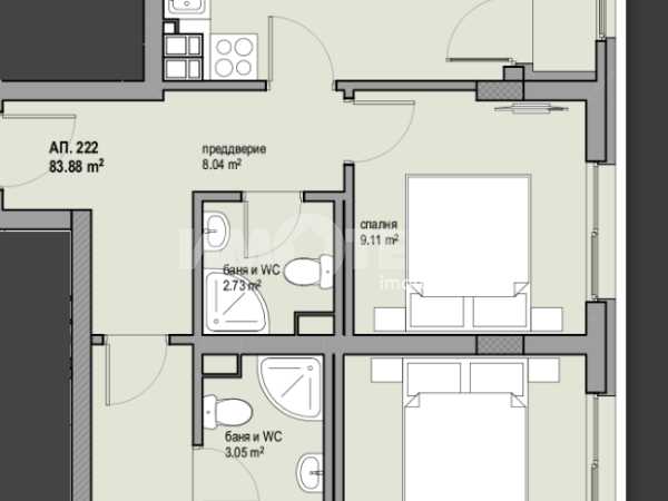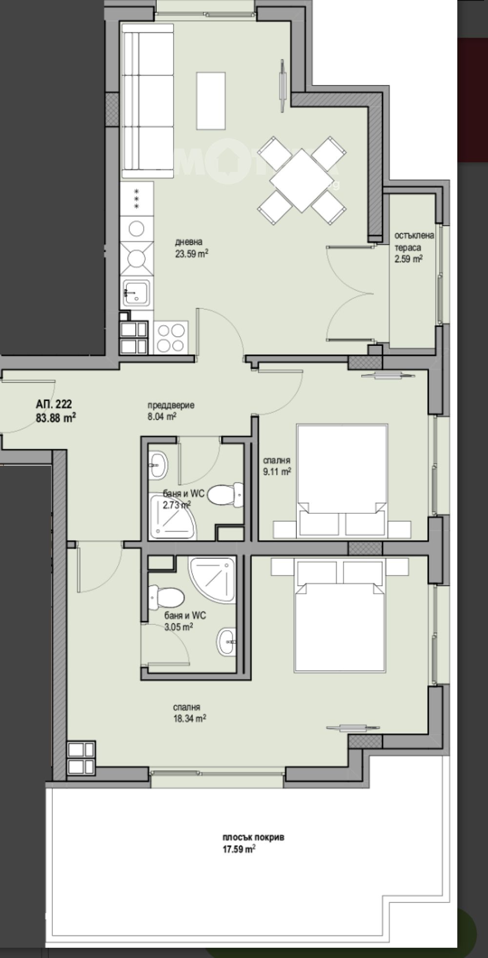 Тристаен апартамент, състоящ се от: преддверие, трапезария с кухненски бокс., две непреходни спални, баня с тоалетна, склад, балкон и тераса от 17,50 кв.м. Изложението е юг. Има възможност за закупуване на паркомясто или гараж.
