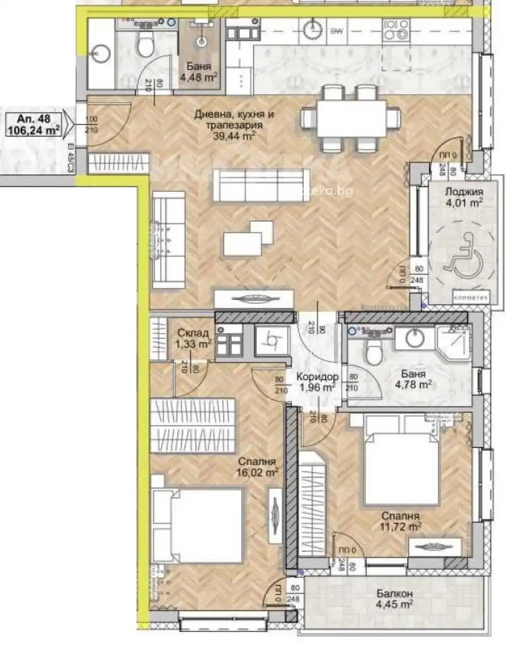 Върху площ от 123 кв.м са разположени хол с трапезария и кухненски бокс (40 кв.м), две спални съответно 16 и 18 кв.м, две бани и две тераси.