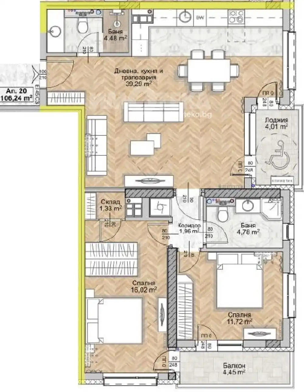 Върху площ от 123 кв.м са разположени хол с трапезария и кухненски бокс (40 кв.м), две спални съответно 16 и 18 кв.м, две бани и две тераси.