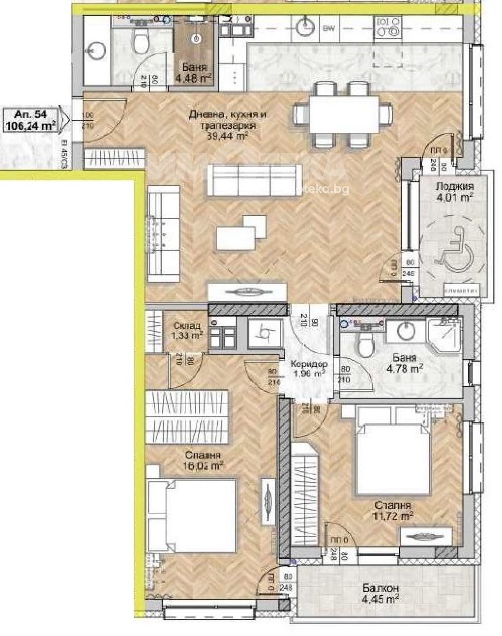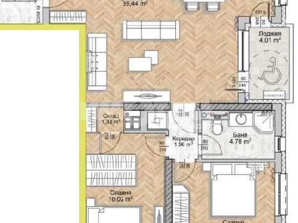 Върху площ от 123 кв.м са разположени хол с трапезария и кухненски бокс (40 кв.м), две спални съответно 16 и 18 кв.м, две бани и две тераси.