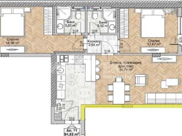 Върху площ от 110 кв.м са разположени хол с трапезария и кухненски бокс (35 кв.м), две спални съответно 13 и 19 кв.м, две бани и югоизточна лоджия.