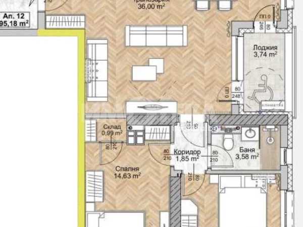 Върху площ от 110 кв.м са разположени хол с трапезария и кухненски бокс (36 кв.м), две спални съответно 15 и 9 кв.м, две бани и две тераси.